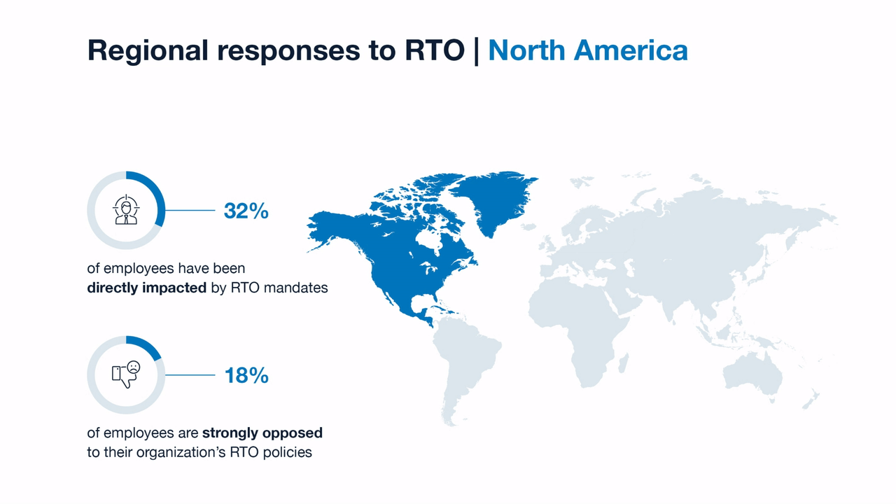 Regional responses to RTO vary: 47% of employees in Asia have been directly impacted by RTO, compared to 34% in Europe and 32% in North America. Still, strong opposition is highest in North America (18%) and much lower in Europe (7%) and Asia (3%), signaling that American employees may have more extreme expectations for work flexibility.