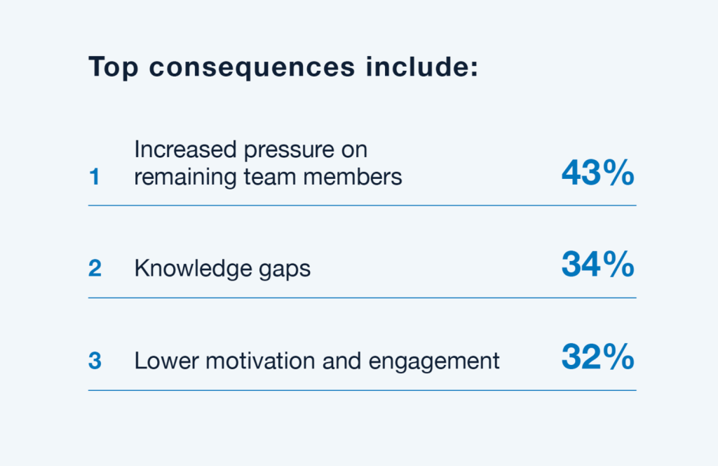 Failing to address burnout head-on risks not only eroding employee morale and productivity, but also losing key talent. The turnover of high-performing employees creates additional hurdles for organizations, with 91% of respondents saying that the loss of high-performing colleagues impacts the organization.