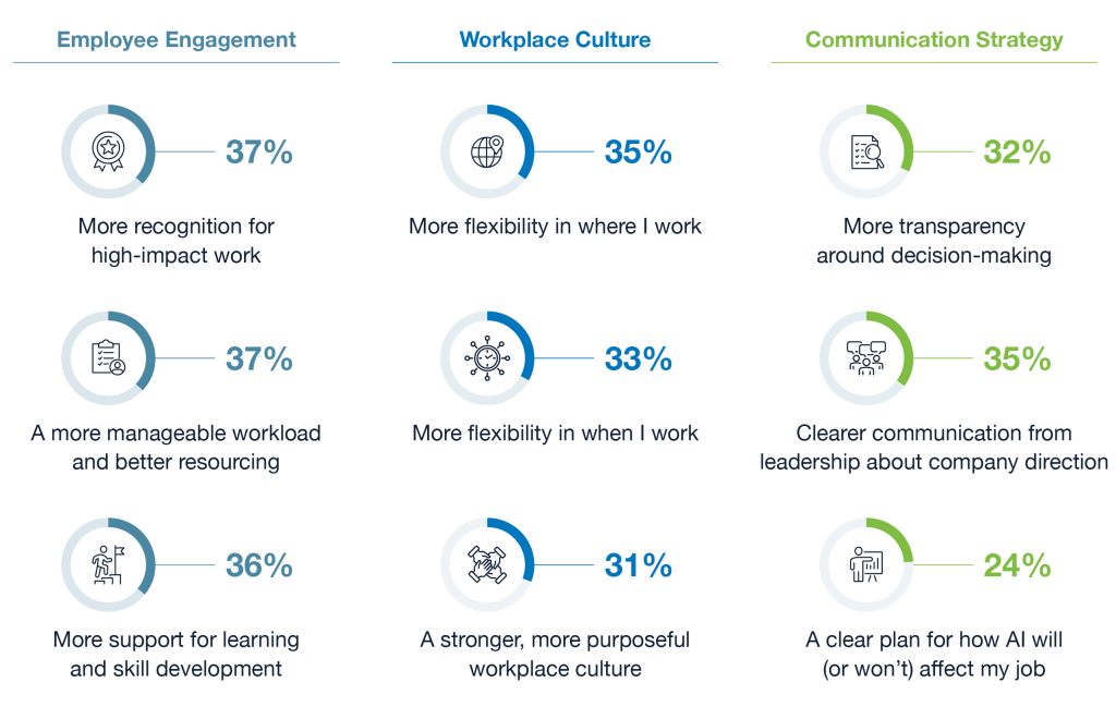 The call for a more effective workplace culture runs deep. Nearly one-third of respondents (31%) chose “a stronger, more purposeful workplace culture” as one of the Top 3 improvements they want from their employer over the next year.