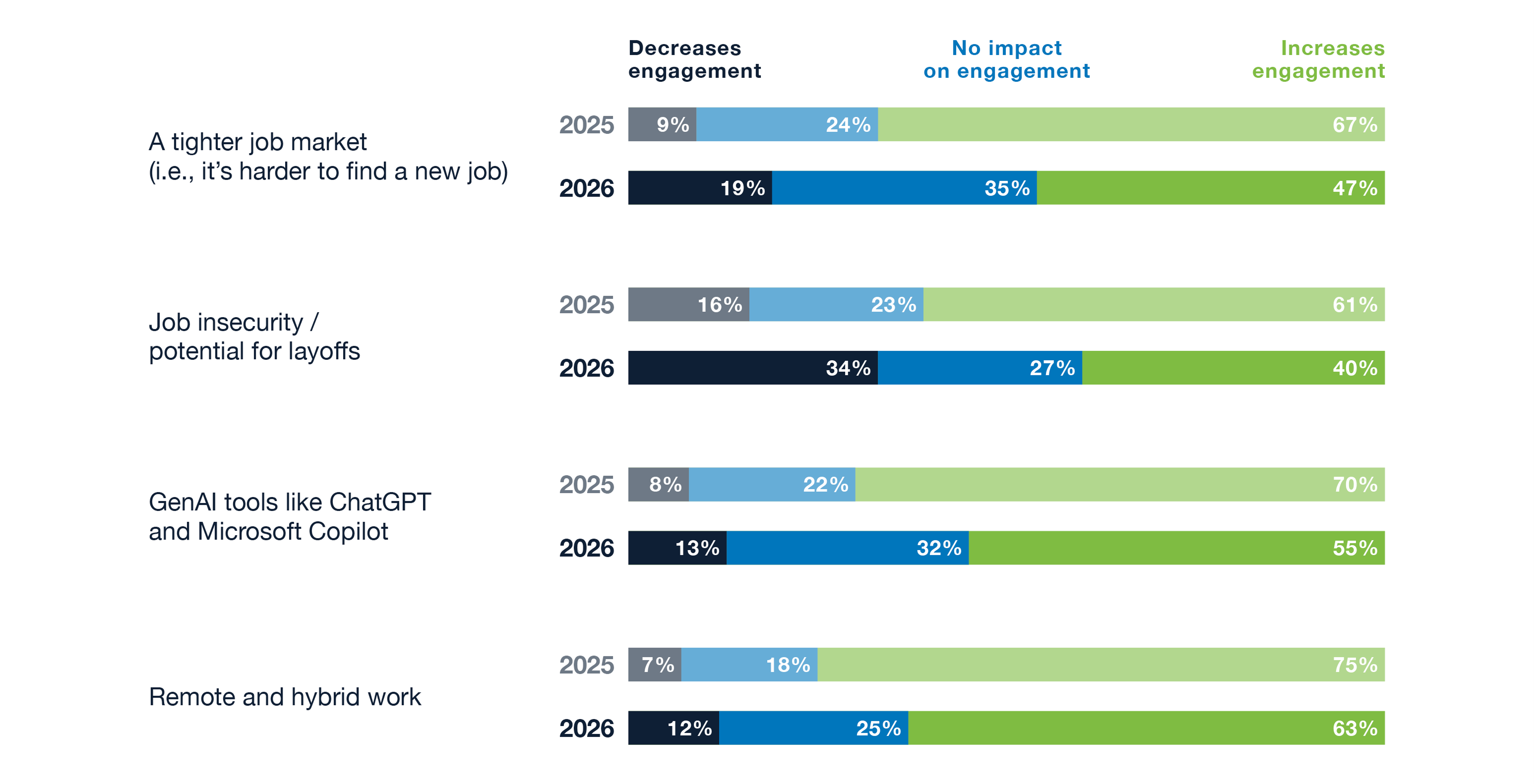 Yet, as flexible work and AI become standard realities, their positive impact on engagement is fading. Many employees are feeling the strain as the novelty of flexible work and AI diminishes and job security grows less certain more broadly.