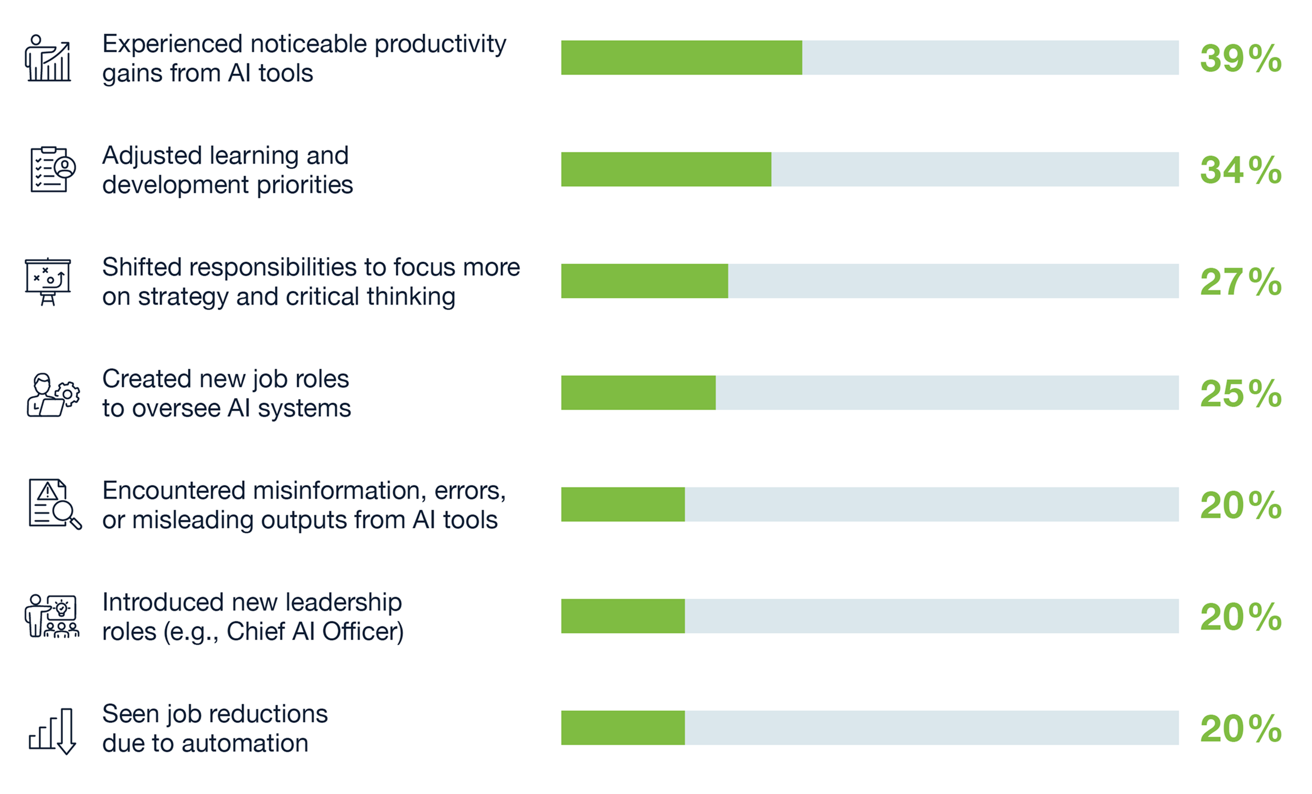 Organizations are responding by adjusting learning and development priorities (34%), shifting more responsibilities to strategy and critical thinking (27%), and creating new roles to oversee AI systems (25%).