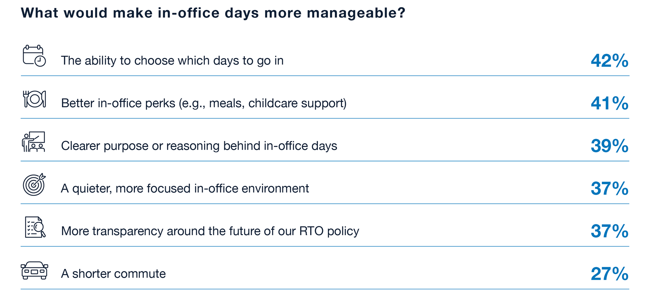 Underlying this resistance is a desire for clarity and choice. Employees want a say in their in-office experience, with the option to choose which days to come in as their top request.